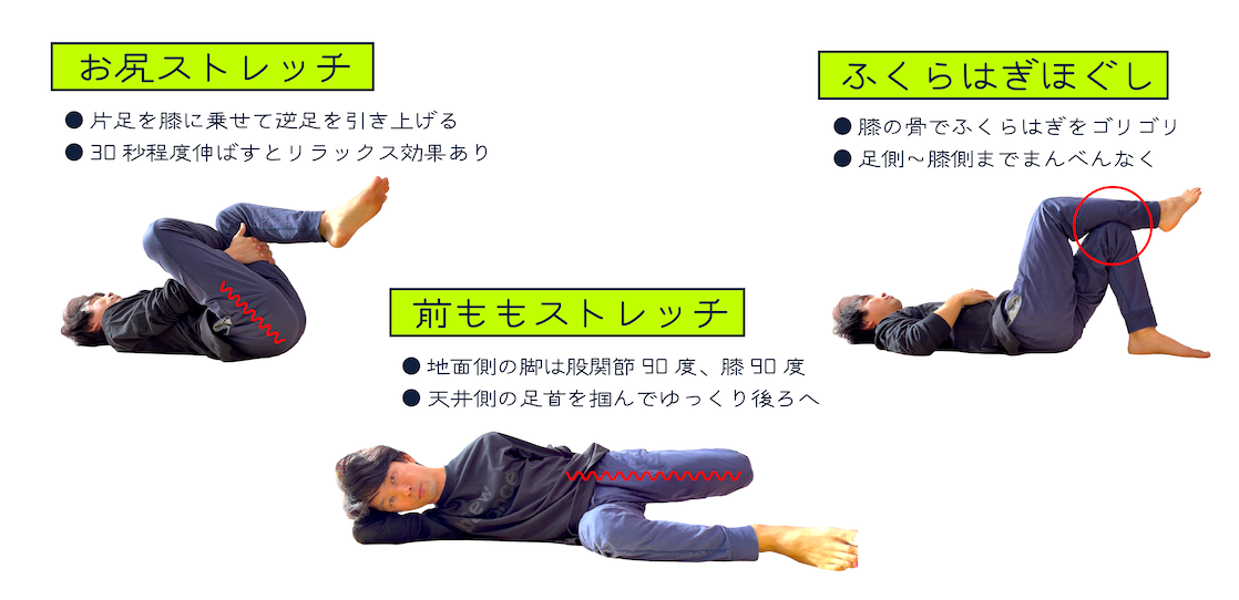 どこが疲れてるかよくわからないという方は、前ももやもも裏、お尻、ふくらはぎ等の下半身の筋肉のストレッチを行うと良いでしょう。全身の約6割の筋肉が下半身に集まっているため、下半身のストレッチをすることで血流の改善や、睡眠の質を高める効果も期待できます。