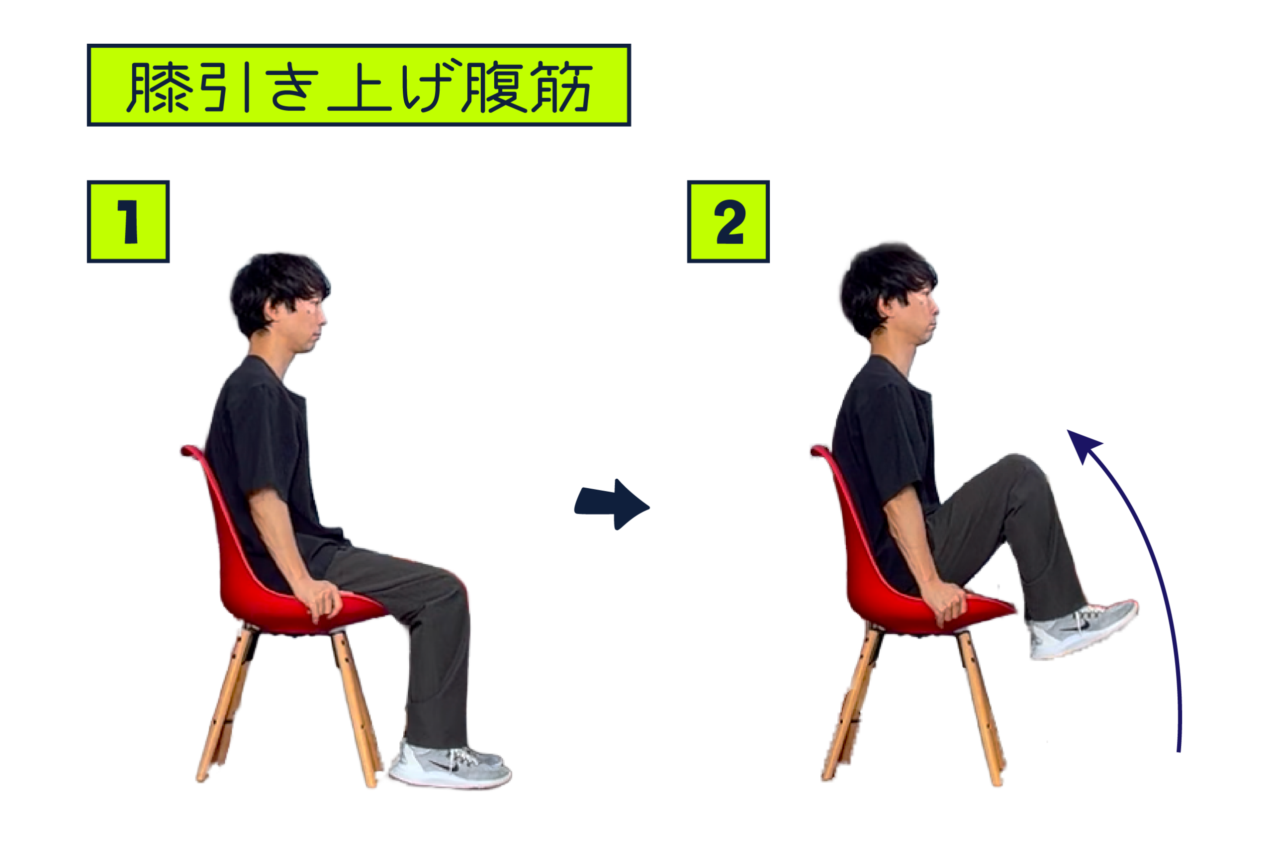 簡単なのは、椅子に座った状態から、両足を地面から持ち上げて浮かせた状態でキープする運動です。ちょっと下っ腹のところがキュッとなるかと思います。
